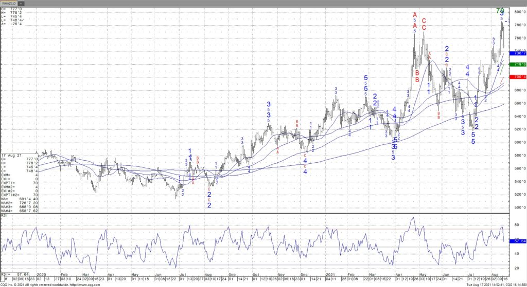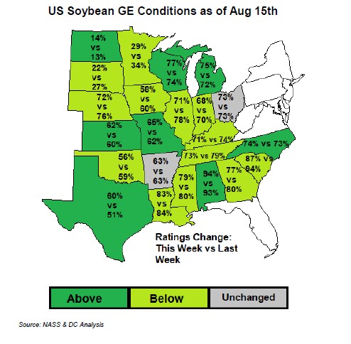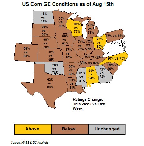 Corn futures ended lower and near session lows. Fact USDA dropped weekly US corn crop ratings offered early support. Sharp losses in equites and energies may have triggered long liquidation on grains. Fact that longs bought US Dollar in a flight to quality may have also offered resistance to Ag futures. CZZ ended near 5,63 with range 5.61 to 5.73. USDA dropped US corn ratings from 64 pct G/E to Most Midwest states dropped. Ratings did increase in WI and OH. Highest rated crops are in OH, WI, MI, KY, IL and IN. Lowest in MN, ND and SD. Pro Farmer est OH corn yield near 185 vs USDA 193 and 171. Tour tends to underestimate OH corn yield. Tour also est SD corn yield near 151 vs USDA 133 and 162 ly. Tour tends to overstate SD corn yield. Key could be tour IL and IA corn yield. Tour tends to est IL/IA corn yield below USDA August est. USDA est IL yield near 214 vs 192 ly, IA 193 vs 178 ly. Rain is due parts of MN, IA, IL and IN next week. Noon GFS added rain for WCB and IL Sat through Tue. This may be overdone. Maps reduced rain Monday in NE and SD Monday and much of the central Midwest and Delta Aug 29-31. This may be needed. There was talk that Brazil may not be offering corn for export after Oct. Brazil domestic corn price is above 8.00 through March 2022. High domestic price could limit exports. Some feel there may be end user buying below 5.60 CZ.