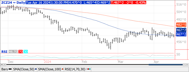 Prices were $.00 ½ – $.02 lower today with spreads firming on strong cash basis.  May-24 remains stuck in a $4.24 ½ – $4.48 range.  Dec-24 has yet to break out of the daily range from Mch 28th of $4.60 ¾ – $4.81.  Showers have spread over the NW third of the US corn and soybean belt the past 24 hours with some areas picking up 2+” so far.  Much cooler temperatures will fill in behind this system with overnight lows expected to dip into the mid 20’s this weekend for the Dakotas, along with parts of MN and northern NE.  US plantings advanced only 3% LW to 6% complete vs. 7% YA and the 5-year Ave. of 6%.  Plantings were at the low end of expectations.  USDA Sec. Vilsack speaking yesterday in Washington DC remains hopeful the revised model to determine whether corn based ethanol will qualify for tax credits in the production of SAF will be announced by the end of April.  Ukraine’s Ag. Ministry expects 2024 grain harvest will only reach 52 mmt, down from 58 mmt YA.  They forecast corn production will reach 27 mmt, same as YA, however down from the USDA forecast of 29.5 mmt.  Dr. Michael Cordonnier lowered his Argentine corn production forecast 3 mmt to 50 mmt, in line with the Argentine exchanges and well below the USDA forecast of 55 mmt.  Tomorrow’s EIA report is expected to show ethanol production to range from 1,033 – 1,051 tbd last week, down from 1,056 tbd the previous week.
