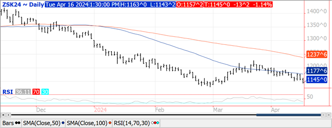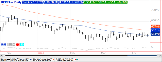 Prices were little changed today with KC and MGEX up $.01 – $.03 while Chicago was $.02 – $.04 lower.  Widespread rain is still lacking for much of western KN along with OK and TX panhandles for the next week to 10 days.  Overall ratings remain the highest since 2020. Two states jump out, KS saw G/E ratings slip 6% to 43% G/E, while poor/VP increased 5% to 19%.  Ratings in IL jumped 13% to 78%.  11% of the crop is headed, vs 9% YA and the 5-year Ave. of 7%.  Spring wheat plantings advanced 4% to 7% complete, vs. 2% YA and 5-year Ave. of 6%.  Ukraine’s Ag. Ministry forecasts 2024 wheat production at 19 mmt, below the 21.5 mmt YA and well below the USDA forecast of 23.4 mmt. Egypt’s GASC reportedly bought 120k mt of Ukrainian wheat at an average price just over $220/mt FOB.  Freight costs were $35.35/mt.  Russia was the 2nd lowest offer at $230/mt FOB for 180 day LC.  Jordan didn’t buy wheat in their most recent tender.