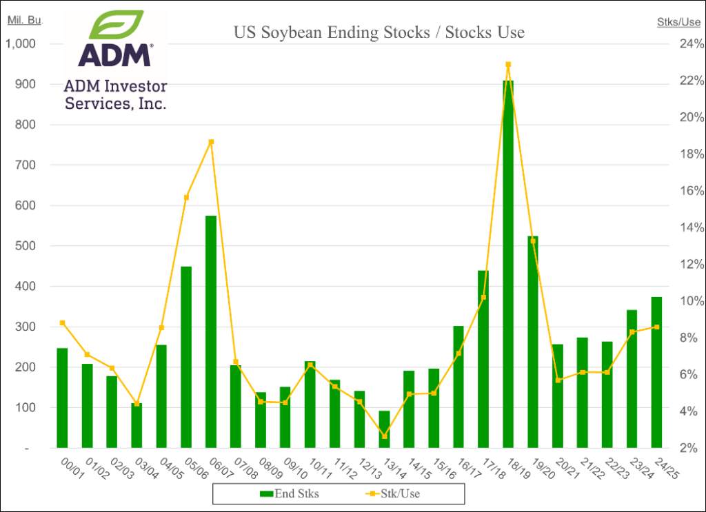 Prices were higher across the complex with beans ranging from $.07-$.16 higher led by old crop, meal was up $3-$4, while oil rebounded to close 10-15 higher.  July-25 futures worked back into a gap from last week, however stalled and closed very near its 100 day MA at $10.39 ½.  July-25 meal posted its highest close in 3 weeks as speculators continue to lighten up on their record short position.  Impressive that July-25 oil was able to scratch out a higher close despite all day weakness in energy prices.  By mid-morning the White House announced tariffs on Chinese imports were now 145%, up from 125% yesterday. Rains are needed across SC growing regions of Brazil before the dry season kicks in next month.  Improved chances for rains in week 2 of the outlook did little to slow the strength in corn.  US soybean stocks were cut 5 mil. bu. to 375 mil., in line with expectations.  Imports were raised 5 mil. with those added supplies more than offset by a 10 mil. bu. increase in crush.  The Ave. US Farm Price was left unchanged at $9.95 bu.  Bean oil stocks were cut 80 mil. lbs. to 1.451 bil. lbs.  Exports were raised 500 mil. lbs. offset by domestic usage down 300 mil. while production was up 120 mil. given the added crush.  Of the lower domestic usage, 200 mil. lbs was from lower usage for biofuel production.  While there were no changes to SA production for the 24/25 crops, last year’s production in Brazil was increased 1.5 mmt to 154.5 mmt.  These added supplies from last year were largely absorbed by higher crush in the 24/25 MY.  Argentina was up .5 mmt to 50.1 mmt, while Brazil’s crush rose 1 mmt to 61.1 mmt.  Global stocks for 24/25 did rise 1.1 mmt to 122.5 mmt, slightly above expectations.