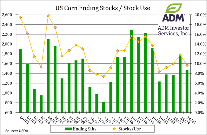 Prices ranged from $.04-$.09 higher closing near session highs led by old crop futures.  July-25 stretched out to 6 week high, taking out both its 50 day MA and high from March.  New crop Dec-25 held in check with US farmers expected to plant nearly 5 mil. more acres than YA.  I look for old crop to continue to outperform new crop.  The USDA cut ending stocks 75 mil. bu. 1.465 bil. 45 mil. below the Ave. trade guess.  Feed usage was lowered 25 mil. exports raised 100 mil. to 2.550 bil. The Ave. Farm Price was left unchanged at $4.35 bu.  No changes to SA production or Chinese imports.  Mexico’s imports rose .5 mmt to a record 25 mmt.  Global stocks were cut 1.3 mmt to 287.65 mmt, due to lower US stocks.  Old crop prices have recovered just over half of the liquidation break from late Feb. to early March.