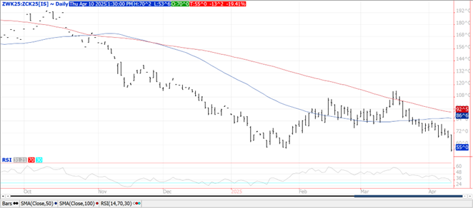 The weakling within the Ag. space as prices ranged from $.02-$.10 lower with KC futures the downside leader.  In the near term little to no rain for the US plains and WCB will help corn planting get underway.  Week 2 of the outlook brings better prospects for rain in the Southern plains.  Outside day down in July-25 KC futures, unable to hold early strength above its 100 day MA.  US ending stocks increased 25 mil. bu. to 846 mil. 20 mil. above expectations.  Imports rose 10 mil. bu. while exports were lowered 15 mil.  HRW stocks jumped up 26 mil., spring wheat stocks rose 16 mil., while durum was down 13 mil.  SRW wheat stocks (CGO) held steady at 116 mil. bu.  The Ave. US Farm Price was unchanged at $5.50 bu.  Global stocks were up .6 mmt to 260.7 mmt.  Russian exports were down 1 mmt, Ukraine/Canada up .5 mmt, EU/Australia down .5 mmt.  US WW area in drought dropped 5% LW to 32%, still well above the 15% from YA.  Spring wheat area in drought rose 4% to 43%, nearly double the 22% from YA.  May-25 CGO wheat spread over May-25 corn plunged $.13 today to a new low at $.55 bu. as abundant wheat stocks will try to work more into feed rations.