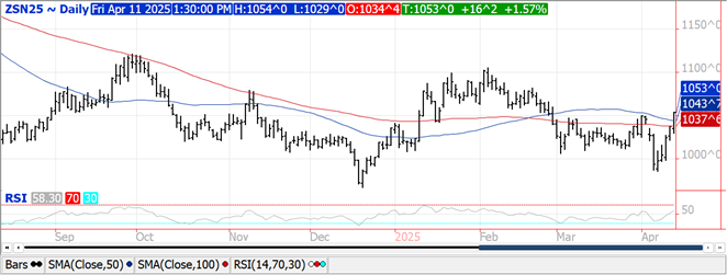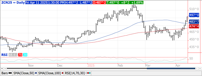 The entire soybean complex was higher today with beans up $.14-$.20 led by new crop, meal was $1-$2 higher while oil surged over $.01 lb. July-25 beans have surged thru MA resistance jumping out to a fresh 6 week high. July-25 meal has jumped out to a 3 week high with the rally pausing near the 50 day MA at $307.80. Meal closed higher every day this week as speculators unwind a portion of their record short position. New high for the week in July-25 oil with next resistance at the April high near $.49 lb. China has raised tariffs on US imports to 125% while indicating they would not match any further increases by Team Trump as US products are already no longer marketable in their country. China’s Minister of Finance stated that any further increases would be a joke and economically meaningless. The USDA announced the sale of 121k mt (4.4 mil. bu.) to an unknown buyer, roughly half old crop 24/25 MY and half 25/26 MY. As the US/China trade war heats up, so has China’s purchases of Brazilian soybeans. They have reportedly purchased over 40 cargoes from our SA competitor this week. The more China buys from Brazil, the less Brazil can sell to everyone else. Farmers in Brazil reportedly have already sold over 50% of this year’s harvest, a record high for early April. Yesterday’s export sales report showed outstanding sales of US beans to China/unknown has slipped to 79 mil. bu., still above the 49 mil. from YA. The BAGE shows Argentine soybean harvest is just getting underway with 3% of that crop gathered. This is well below the 11% YA and the 5-year Ave. of 7%.