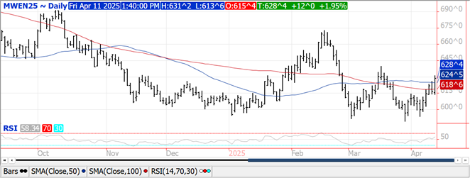 Futures surged closing near session highs with prices ranging from $.10-$.18 higher. CGO and MGEX futures jumped out to 3 week highs. Next resistance for July-25 CGO is the 100 day MA at $5.73 ¼. Next resistance for July-25 MGEX is the March high just below $6.40. Wire services are also reporting Russia’s winter crops may have experienced hail damage from storms earlier this week.Yesterday’s bearish WASDE report seems like a distant memory. Global stocks/use among major exporters was little changed in yesterday’s WASDE holding at 15.5%, up from 15% YA.