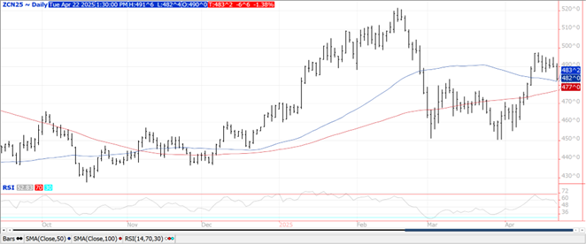 Prices were $.05-$.07 lower with new crop futures leading the declines.  Nearby spreads firmed while new crop spreads weakened.  July-25 violated support at LW’s low at $4.87 however held above its 50 day MA at $4.82.  Warm/wet conditions will be the dominate weather feature across the US midsection into early May.  Rains this week across key growing areas of Brazil will keep their 2nd corn crop prospects high.  US corn plantings advanced 8% LW to 12% complete, at the high end of the range of guesses and well above my expectations.  Progress is just above the YA pace of 11% and the 5-year Ave. of 10%.  2% of the crop has emerged.  EU corn imports as of April 20th at 16.8 mmt are up 12.8% from YA.  While exports remain strong there is a growing sentiment that lower domestic feed usage and usage for ethanol production will offset higher exports in future WASDE reports keeping US ending stocks above 1.45 bil. bu.  Dr. Michael Cordonnier raised his Brazilian corn production est. 3 mmt to 125 mmt while also raising his Argentine forecast 2 mmt to 48 mmt.  US corn acres have risen from the March intentions report to the June acreage report the last 4 years and 18 of the last 25.  However, corn acres have exceeded 95 mil. in the March intentions only 3 times prior to this year.  In 2 of those years final acres fell from the March intentions while increasing 1 year.  Today’s trade action seems to be trying to prevent additional corn acres drawing away from soybeans.
