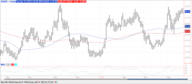 Prices were mixed with beans ranging from $.01-$.05 higher with old crop the upside leader.  Meal slipped late to close steady to $1 lower while oil was 20-30 lower.  Bean spreads rallied while product spreads were mixed.  Inside trade for July-25 beans as prices rebound from a test of the 50 and 100 day MA’s near $10.39.  July-25 meal closed back below $300 per ton for the first time in 2 weeks.  Choppy trade in July-25 bean oil as prices pulled back after stalling just below the April high near $.49 lb.  Spot board crush margins broke $.10 ½ today to $1.30 ½ bu. with bean oil PV holding steady at 44.9%.  Soybeans drew support from reports that of China was active buying of Brazilian beans.  Comments from US Treasury Sec. Bessent that the trade war with China is unsustainable and that he expects the situation to de-escalate soon also provided a boost. An uptick in the generation of R4 RIN’s in March would suggest a rebound of biodiesel and RD in the month of March.  The official production figures from the EIA for the month of Feb-25 are due out the middle of next week.  Soybean plantings at 8% were also at the high end of expectations and above the YA pace of 7% and 5-year Ave. of 5%.  EU soybean imports as of April 20th at 11.2 mmt are up 8.7% from YA.  Soybean meal imports at 15.1 mmt are up 25.8%.  Dr. Michael Cordonnier raised his Argentine production forecast 1 mmt to 49 mmt, in line with the USDA.  He held his Brazilian est. unchanged at 169 mmt which matches the USDA forecast and slightly above the Conab est. of 167.9 mmt.