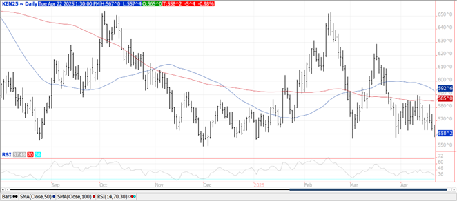 Prices range from $.02-$.06 lower across the 3 classes today.  KC futures was the downside leader, unable to hold overnight strength while falling to a new low for the month.  Next support for July-25 KC is at the Mch-25 low at $5.56 ½.  Spreads were mixed.  July-25 CGO fell to a fresh 2 week low.  The heaviest concentration of rainfall over the next 7 days will be in the Southern plains and WCB where 1.5-3” totals are expected.  While this will work to ease drought conditions in these areas, it will also slow spring plantings.  Spring wheat plantings jump 10% to 17% complete above its 5-year Ave. of 12%.  Winter wheat conditions slipped 2% to 45% G/E, compared to 50% YA while the percentage of the crop rated Poor/VP jumped 2% to 21%.  The drop in ratings was more than expected led by an 11% plunge in IL and an 8% drop in SD.  Kansas, by far the largest producing state, saw a 2% point drop in ratings.