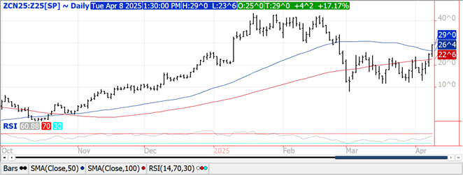 Prices ranged from $.02 lower to $.04 ½ higher led by old crop.  Spreads continue to firm despite today being day 2 of the Goldman roll.  July-25 traded to a fresh 2 week high while closing above its 100 day MA at $4.73 ¼.  The July/Dec spread traded back up to a $.29 inverse and IMO will challenge the Jan. high just above $.43.  The USDA announced the sale of 240k mt (9.5 mil. bu.) of corn to Spain.  Planting progress reached 2% as of Sunday, vs. 3% YA while in line with the 5-year Ave.  States most impacted by LW’s flooding rain saw progress at 31% in AK, 6% in MO, 3% in TN while only 1% in KY.  Little progress likely in this region this week while the WCB gets going.  China’s Ag. Ministry continues to shift gears in trying to be more food independent by approving 97 GMO corn varieties along with 2 more soybean varieties.  EU corn imports for 24/25 as of April 6th at 16.2 mmt are up 12.5% from YA.