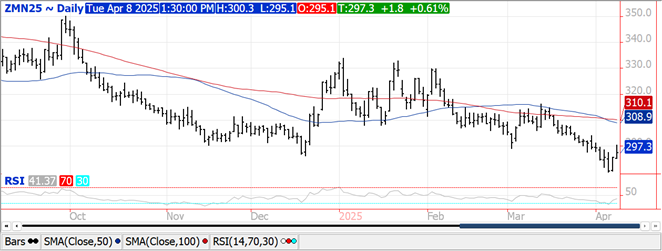 Prices were mixed with beans ranging from $.05 lower to $.10 higher with strength limited to old crop.  Meal was $1-$3 higher while oil has drifted back 10-20 points.  Bean and meal spreads firmed while oil spreads were mixed.  July-25 beans closed back above $10.  Next major overhead resistance is at the 100 day MA at $10.37 ½ which is also in a gap created by last Thursday’s lower open.  July-25 meal traded back above $300 a ton for the 1st time in a week.  July-25 oil held support above its 50 day MA at 45.19.  Spot board crush margins slipped $.06 to $1.42 per bu. while bean oil PV drifted back to 43.6%.  China reportedly bought several cargoes of Brazilian beans triggering a spike in basis.  The record amount of Brazilian soybean shipped to China in Q1 will almost certainly extend into record Q2 shipments as well. News during the session that reciprocal tariffs, including 104% on Chinese imports, will take effect at 12:01 AM EST took all the wind out of the early surge on Wall Street.  Wire services have reported that Pres. Trump has instructed his trade team to create “tailor made” deals for the nearly 70 countries that have pursued trade talks.  Reciprocal tariffs will be applied while these negotiations take place.  US biofuel manufacturers and big oil have reportedly recommended the EPA mandate biomass diesel blending increase to 5.25 bil. gallons in 2026.  While up from only 3.35 bil. currently, it was below hopes it may increase into the 5.50 – 5.75 bil. gallon range.  Mandates remains well below current capacity of 6.575 bil. gallons.  A few states have reported planting progress with LA and AK leading the way with 11% of the crop seeded.  The recent closure of Argentine crusher Vicentin, accounts for roughly 9% crush capacity for the world’s leading exporter of meal and oil, has allowed domestic crush margins to reach a 5 month high recently at $1.50 bu.  EU soybean imports at 10.3 mmt are 4% above YA.  Meal imports at 14.4 mmt are up 26%.