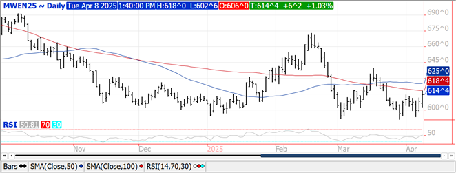 Prices were higher across all 3 classes with gains ranging from $.02-$.07.  July-25 CGO briefly traded to a 2 week high before backing up.  The early jump in July-25 MGEX stalled just below its 100 day MA at $6.18 ¼.  US winter wheat ratings at 48% G/E were in line with our expectations and down from 54% YA.  21% of the crop is in P/VP condition vs. only 12% YA.  Ratings in KS did show modest improvement with 51% of the crop rated G/E, up 2% for the week.  17% of the KS crop was rated P/VP, unchanged for the week.  5% of the crop is headed, vs. 6% YA.  Spring wheat plantings have reached 3%, in line with YA and the 5-year Ave.  Jordan reportedly bought 60k mt of optional origin wheat paying $62/mt CF for Aug. shipment.  EU soft wheat exports at 16.4 mmt are down 34% from YA.  Wires service reporting that frost and hail damage will hurt wheat production in Russia’s 3rd largest wheat producing region of Stacropol.