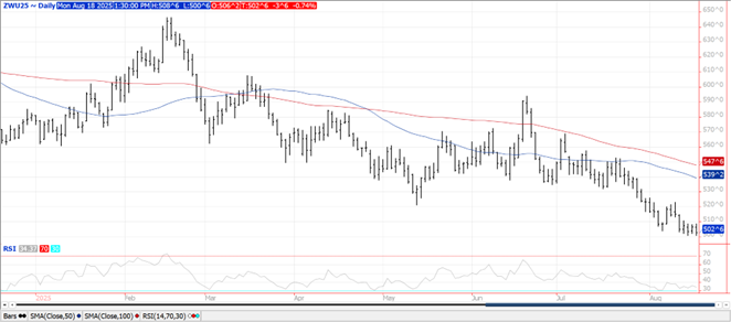 Prices ranged from steady to $.03 lower across the three classes. Sept-25 CGO matched LW’s contract low however continues to hold support just above $5.00. Same story for Sept-25 KC. New contract low for Sept-25 MIAX. Export inspections at 15 mil. bu. were at the low end of expectations and below the 17 mil. needed to reach the revised USDA forecast of 1.875 bil. YTD inspections at 177 mil. bu. are up 4% from YA, vs. the USDA forecast of up 6%. SovEcon expects Russia’s grain exports will rebound to 4.5 mmt, up from only 2.9 mmt in July. IKAR raised their Russian production forecast 1 mmt to 85.5 mmt, above the USDA forecast of 83.5 mmt. IKAR also raised their export forecast to 42.5 mmt, well above the USDA at 39 mmt. Egypt’s Ag. Ministry has reportedly purchased 4 mmt of wheat from local harvest since April-25.