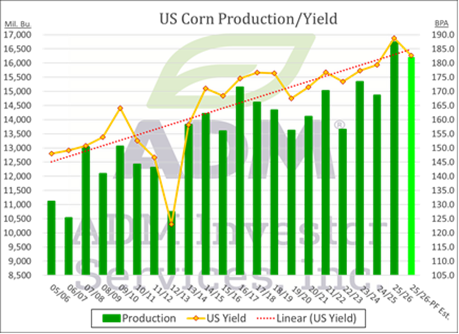 Prices closed within a penny of unchanged in 2 sided trade.  Dec-25 held within yesterday’s range.  Although Sept/Dec has carved out a fresh low, the spread rebounded late to narrow up $.01 ¼.  Overhead resistance for Dec-25 is at the 50 day MA at $4.18 which could be challenged Sunday night with the lower than expected production forecast from PF after today’s close.  They est. the US 2025 corn crop at 16.204 bil. bu., 538 mil. below the USDA est. in August.  Their average yield forecast at 182.7 bpa is well below the USDA est. of 188.8 bpa.  The USDA announced sales of 120k mt (4.7 mil. bu.) to Costa Rica and 140.5k mt (5.5 mil. bu.) to Spain.  Heat and drought stress is taking a toll on France’s corn crop where conditions slipped 3% LW to 62% G/E, well below the 76% YA.  The BAGE reports Argentine harvest advanced 1% LW to 96% complete while maintaining their production forecast at 49 mmt, vs. the USDA est. of 50 mmt.  Cattle on feed as of Aug. 1st at 98% of YA was in line with expectations.  Placements at 94% were above expectations of 91% while marketing at 94% were in line with expectations.