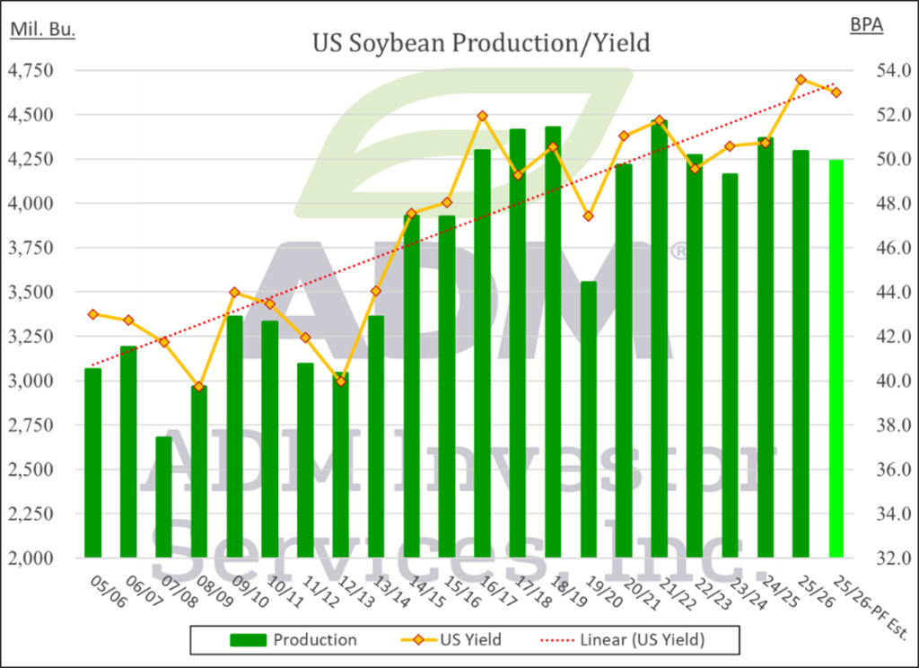 Prices were mixed with beans up $.02-$.03, meal was steady to $3 lower while oil closed 120-145 points higher.  Meal spreads continue to surge as hand-to-mouth buyers appear to be in short supply.  There were net cancellations of another 97 contracts registered for delivery with the CME against soybean meal futures.  Nearby bean spreads softened while back months have firmed.  Oil spreads weakened on the price surge.  Nov-25 beans jumped out to a fresh 2-month with next resistance is at the June high of $10.74 ¼.  Sept-25 oil jumped to a new high for the month with next resistance at the July high at 57.64.  For now Sept-25 meal rejected trade back above $300 ton. The EPA ruled on 175 petitions (of the roughly 200) seeking relief from the nation’s RFS.  Of those petitions considered 63 were granted full exemptions, 77 received partial exemptions (50%), 28 were denied while 7 were determined to be ineligible.  The EPA added that refiners that were approved for exemptions had complied with the law and will have RIN credits returned, however credits returned from before 2023 will not be eligible for future compliance obligations.  The EPA will return 1.39 bil. in credits for 2023 and 2024 that can be used for future compliance with total exemptions amounting to 5.34 bil. RINS.  The EPA will seek public comment on whether larger refiners should make up for the exempted gallons.  Still much uncertainty as big oil will surely challenge in court any reallocation effort by the EPA.  Spot board crush margins surged another $.11 today to $2.19 ½ bu., a 2 week high, while bean oil PV improved to 48%.  While remaining doubtful small refineries experience disproportionate economic hardship due to the RFS they announced they were pleased the EPA was taking a “reasonable approach to the SRE backlog”.  Pro Farmer estimates the 2025 soybean crop at 4.246 bil. bu., 46 mil. below the USDA.  Their Ave. yield forecast at 53.0 bpa, is still a record high, however below the USDA est. of 53.6 bpa.