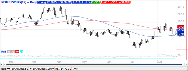 Prices ranged from steady in MIAX to down $.05 in KC.  Prices were slightly lower for all 3 classes for the week.  Spreads leaned slightly lower in KC and CGO.  Ukraine has so far harvested 27.25 mmt of grain which includes 21 mmt of wheat.  Of this volume roughly half is considered to be of milling quality with 1.7 mmt of the milling wheat being allocated for domestic bread production.  Russia Ag. Ministry has reinstated an export tax on wheat, raising it to 32.1 roubles/mt for the period ending Sept. 2nd.  Still awaiting for progress on a Putin/Zelensky peace summit and clarity on security guarantees or the potential for tougher US sanctions on Russia.  Slightly higher production forecasts from Russia may loosen up global stocks as it has weighed on global FOB offerings.  Heavy rains for the S. plains next week to recharge subsoil moisture ahead of fall plantings likely the reason for KC sliding back below spot CGO futures despite the strong HRW exports.