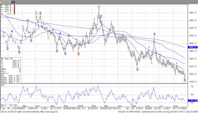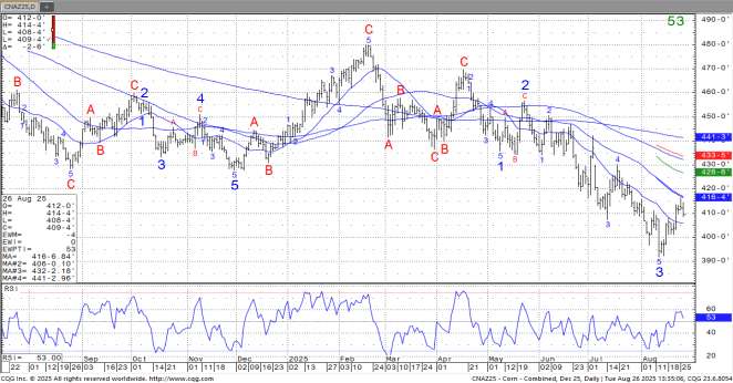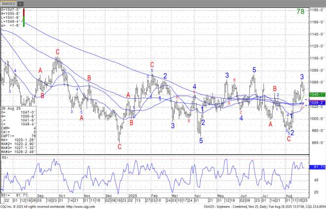 CZ is near 4.09. One estimate of lower US 2025 corn yield and good US exports have supported CZ. CZ is unable to trade over 4.16 resistance. Support is 4.05. US Midwest weather is mostly dry but cool. Harvest is into KY where corn yields are reported at record high. USDA rated the US crop 71 pct G/E unch from last week but up vs 65 ly. One analyst est US corn yield near 187.1. Another remains near 184.0 but concedes that final yield could be between 184.0 and 188.0. Same analyst is est Brazil corn crop at 140 mmt. CU open interest is down 38,000 contract but open interest remains near 128,000 which is high going into first notice. One group est US 24/25 corn carryout at 1,420 due to lower residual and 25/26 at 2,485 due to lower exports.