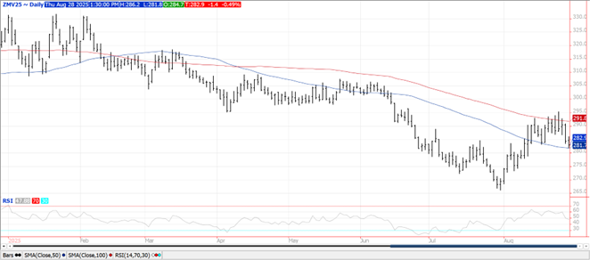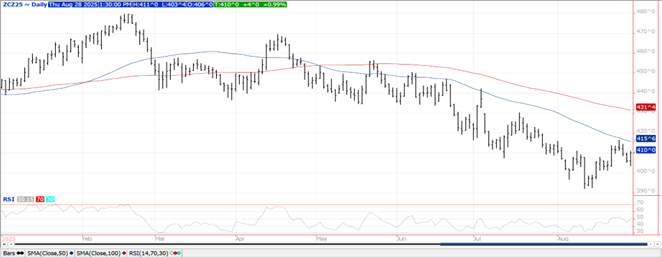 Prices rallied late to close $.03-$.04 higher making fresh highs at the close. Spreads weakened ahead of FND tomorrow as Sept/Dec carved out a new low at ($.25 ½) per bu. Still no registrations for delivery with the CME. The European Commission lowered their EU corn production est. 2.5 mmt to 57.6 mmt, in line with the USDA forecast of 58 mmt. The EC also raised their EU corn import forecast slightly to 18.8 mmt, still below the USDA forecast of 22 mmt. Stats Canada is forecasting Canadian corn production at 15.55 mmt in 2025, just above the 15.23 mmt from YA. The LSEG is forecasting US corn production at 16.320 bil. bu. 422 mil. bu. below the USDA, as they see lower acres and a lower average yield of 185.4 bpa, below the USDA est. of 188.8 bpa. Export sales at 81 mil. bu. were in line with expectations. Old crop commitments slipped to 2.774 bil. still up 26% from YA, vs. the USDA forecast of up 25%. New crop commitments jumped to 739 mil. bu., double the YA pace and the highest in 4 years. Noted buyers were Mexico – 24 mil., unknown – 20 mil. while Colombia bought 10 mil. Since 1990 the USDA has raised corn yields 18 times in the month of August. In 12 of those years final yields were below the August forecast, while 6 times it was higher. Oddly enough the last 6 times corn yields rose in August, final yields were below the August estimate by an average of 2.67 bpa.