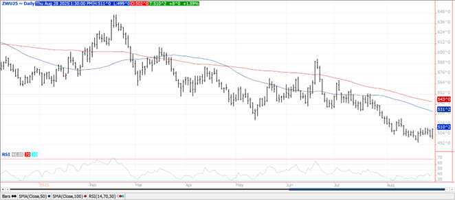 A late surge saw prices close in a range from $.02 to $.08 higher. Spreads firmed led a an $.08 higher close in Sept-25 CGO. New CL and 5 year low for spot KC in early weakness. Support for Sept-25 CGO is at the contract low at $4.94 ½. Argus Media raised their Russian wheat production forecast 1.3 mmt to 86.1 mmt vs. the USDA est. at 83.5 mmt. As of Aug. 27th Ukraine has harvested 3.7 mmt of grain, or which 2.26 mmt is wheat and .857 mmt is corn. Stats Canada all wheat production forecast at 35.55 mmt was slightly below the Ave. trade guess of 35.9 mmt however within the range of estimates. Their spring wheat crop is expected to reach 26 mmt, above the 25.35 mmt from YA. The USDA is forecasting Canada’s all wheat production at 35 mmt. US wheat exports at 21 mil. bu. were in line with expectations. YTD commitments at 445 mil. bu. are the highest in 5 years and up 23% from YA, vs. the USDA forecast of up 6%. By class commitments vs. the USDA forecast are: HRW up 110% vs. USDA up 38%, SRW up 6% vs. up 3%, HRS down 6.5% vs. down 4%, and white down 13% vs. down 14%.