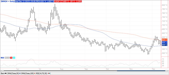 Prices were sharply lower across all 3 classes as the day to day choppiness continues.   Chicago and MGEX were down $.15 – $.20, while KC plunged $.22 – $.25.  Mch-24 Chicago closed below yesterday’s low, however held above the 50 day MA support at $6.00 ¼.  Mch-24 KC briefly traded below this week’s low of $6.30 ¼.  Algeria reportedly bought over 900k mt of milling wheat at around $273/mt CF, likely sourced from the Black Sea region for Feb/Mch-24 shipment.  Since July 1st Ukraine has exported 6.3 mmt of wheat, down 15% from YA.  Ukrainian officials are optimistic total exports in Dec-23 can reach 5 mmt up from 3.8 in Nov-23 utilizing the humanitarian corridor.  The US southern plains is receiving a healthy dose of rain midweek helping build moisture reserves for the US winter wheat crop.  Export sales tomorrow are expected to range from 44 – 58 mil. bu. reflective of last week’s large announced sales to China.
