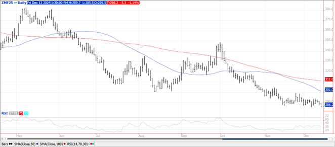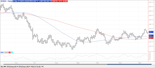 Prices were down $.01 ½ – $.02 ½ for the day and only slightly higher for the week. Spreads firmed slightly. Next significant support for Mch-25 corn not until the 50 day MA near $4.34. Tuesday’s bullish WASDE report seems like a distant memory. With fresh news lacking, the non-threatening weather forecasts in South America tipped prices lower. Ukraine’s Ag. Minister increased their 2024 grain production forecast 1 mmt to 55 mmt. They expect to export 40.3 mmt of grain, well below the 51 mmt shipped in the 23/24 MY. Their corn export forecast at 20.5 mmt (8 mmt already shipped) is well below the USDA est. of 23 mmt. China raised their 2024 grain production forecast to a record 706.5 mmt, up 1.6% from YA. Corn production is estimated at 294.9 mmt, just above the USDA est. of 292 mmt. The BAGE pegs Argentine plantings at 56%, up from 48% LW and well above the 32% from YA. On average 40% of the crop is planted by mid-Dec. Strong demand and tighter US stocks was enough to get prices back to $4.50 but so far no higher with combined Argentine/ Brazilian production pushing record levels.