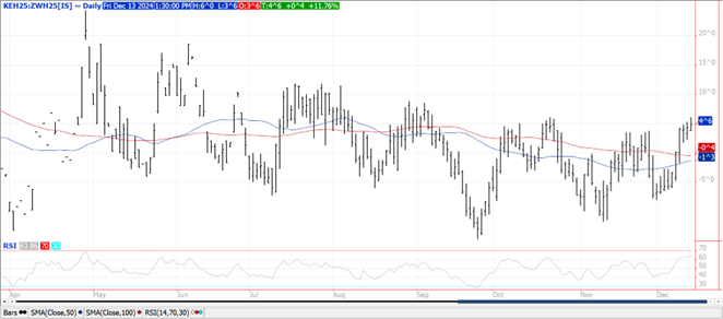Prices were $.04-$.06 lower across all 3 classes today. New lows for the week in Mch-25 Chicago. KC Mch-25 flipped from being $.05 under Chicago to start the week, to $.05 over Chicago to end the week. Dryer conditions in Australia will allow wheat harvest to move along smoothly. Lite snow cover is expected to form over Eastern Ukraine, Southern Russia and Kazakhstan providing some moisture benefit. Low temperatures this weekend are not as harsh as forecasted earlier this week with no crop damage expected. The BAGE reports Argentina’s wheat harvest advanced 16% LW to 64% complete. They left their production est. unchanged at 18.6 mmt, vs. the USDA forecast of 17.5 mmt. China’s Stat Bureau forecast their 2024 wheat production at 140.1 mmt, in line with the USDA est. Ukraine’s Ag. Minister expects their wheat exports for 24/25 MY will reach 16.2 mmt, just below the USDA est. of 16.5 mmt. Wire services are reporting that Russia has halted the shipment of 2 cargoes of wheat to Syria over concerns of payment delays with the new Govt. Ukraine has pledged that they can step up and supply Syria with needed grain and other foodstuffs. Russia’s Govt. has slashed their wheat export tax 15% to 4,136.50 roubles/mt for the period ending Dec. 24th.
