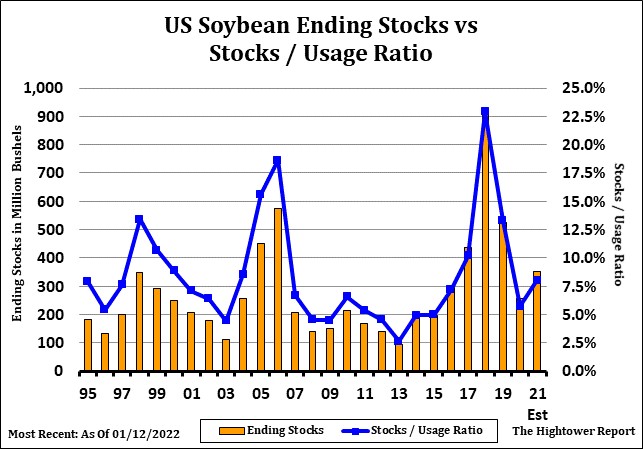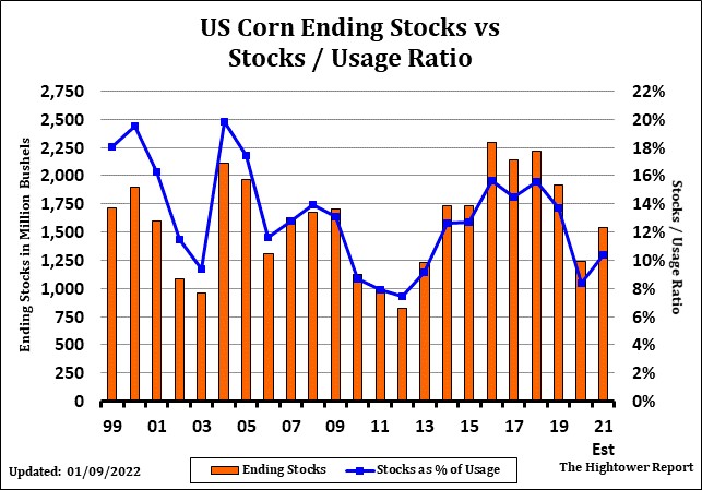 Soybeans ended slightly lower. SH tried to trade over 15.64 after good old and new crop soybean sales. Soymeal gained on soyoil also on good US sales and lower palmoil prices weighed on soyoil. Trade is expecting record Dec soybean crush and higher soyoil stocks. There was also concern that record high palmoil prices could slow demand for palmoil. Weekly US soybean sales were 1,095 mt. Total commit is 45.2 mmt vs 58.5 ly. China commit is near 25.4 mmt. New crop soybean sales increased 881 mt. Weekly US soymeal sales were 605 mt. Total commit is near 7.5 mmt vs 7.2 ly. Talk of a Paraguay soybean crop of only 4.4 mmt vs 10.0 normal could reduce exports to Argentina and a lower Argentina soybean crush. Trade estimates Brazil soybean crop at 133.6 mmt vs USDA 139 and Argentina at 44.5 vs USDA 46.5. 7 mmt drop is well below some est of 24 mmt. Trade est US 2021/22 soybean carryout near 310 mil bu vs USDA 350 in January.