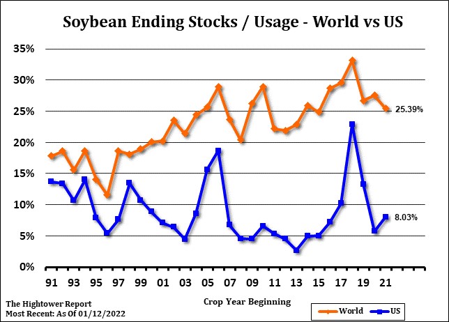 Corn closed lower. There may have been some long liquidation before tomorrow USDA report. Lower than expected Dec 31 Canada wheat stocks may have also triggered some long corn short wheat spreads. Corn bulls may have run out of new bullish news before the USDA February crop report and Conab’s South America crop update. The noon SA weather maps showed increase chances for rain across the dry areas of S Brazil, Argentina and Paraguay. The maps may be too wet. Lower energy prices may be weighing on corn. CH failed to trade over Mondays high. CH has had an inside day. The gap from Mondays higher trade is near 6.23. Trade estimates US 2021/22 corn carryout at 1,512 mil bu vs USDA 1,540. This may not satisfy the bulls. Most private estimates are closer to 1,200. Trade also estimates Brazil soybean crop at 133.6 mmt vs USDA 139.0, Argentina soybean crop at 44.5 mmt vs USDA 46.5. Most looking for confirmation of lower SA corn crop and higher US corn export demand. Some also are afraid to add to positions given uncertainty over potential war in Ukraine and stoppage of Black Sea corn exports especially Ukraine corn.