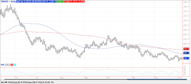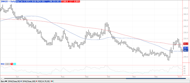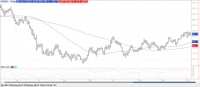 Prices are mixed across the complex with beans $.01-$.03 lower, meal was down $2-$3 while oil was up 30-40 points. Spreads weakened across the complex. Late session weakness was likely driven by comments from a BAGE climatologist stating that expected rains between Jan. 16th and 22nd across key agricultural areas in Argentina would bring significant relief from recent hot/dry conditions. The exchange meteorologist said their models suggest 50-75 millimeters (2-3 inches) of coverage. As temperatures heat up across Argentina and S. Brazil, crop stress will be on the rise in the short-term, however trendline yield are still possible with a more normal rainfall pattern late Jan. into Feb. Weakening basis levels in Brazil continue to limit upside potential. The USDA did announce the sale of 120k mt (4.4 mil. bu.) of soybeans to an unknown buyer. The Mch-25 bean oil recovery stalled out as prices approached $.42 lb. Next major resistance not until the 100 day MA at $.4220. Mch-25 meal for now rejected trade below the $300 level and its 50 day MA. I do look for a 2 mmt increase in their Brazilian bean production estimate to 171 mmt. While spot board crush margins were little changed at $1.24 ¾, bean oil PV rebounded to a 4 week high at 40.9%. History has also shown a bullish bias on January report day for soybeans. Since 2000 spot March futures have closed higher 15 times (60%), while closing lower 10 times.