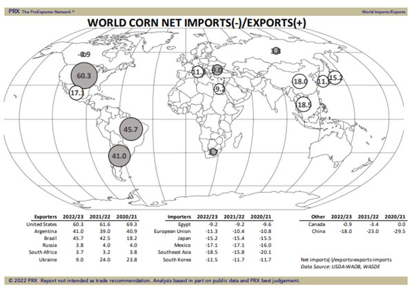 Corn futures were down sharply with CU back below 6.00. Early selling was linked to concern that this week’s US CPI data will show even higher inflation. This could force US Central Bank to increase interest rates until US is in a recession. There was also talk that tomorrow there will be a meeting in Turkey with UN, Ukraine and Russia. This to try to come up with a plan to open Ukraine grain exports. Participants are a military delegation and not diplomats. Russia is not expected to allow exports unless west sanctions are dropped and Ukraine is not expected to de-mine ports unless Russia stop attacks. There was talk of vessels heading to Ukraine port to load grain. These vessels load only 5-6,000 mt and ports can only unload 60 mt of grain per day by truck. Rail service has stopped after key bridge was bombed. Finally, noon GFS US weather turned wetter over the central Midwest over the next 7 days. Some feel the maps were overdone. USDA dropped US 2021/22 feed use 25 mil bu. This increased carryout to 1,510. USDA increased US 2022 corn crop 45 mil bu. Higher imports and higher crop resulted in an increase in carryout to 1,470. USDA increased World 2022/23 end stocks 2 mmt. USDA est Brazil 2023 corn crop at 126 mmt vs 116 this year and Argentina 55 vs 53. They est EU corn crop at 68 mmt with some closer to 62. They est World 2022/23 corn exports at 182 mmt vs 199 last year with Ukraine 9 vs 24.