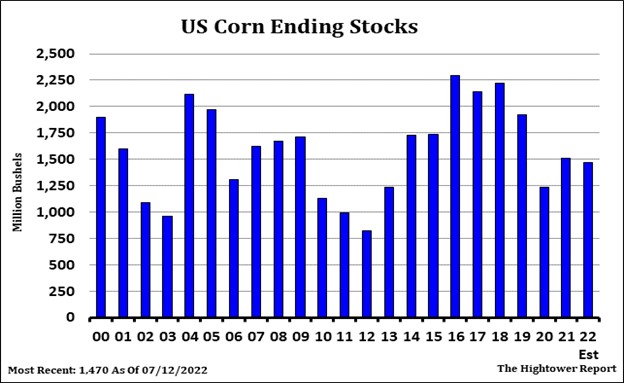 Corn futures ended lower. Signing of a deal between Russia and Ukraine with the UN trying to open Ukraine exports weighed on futures. USDA estimates that 29 pct of US corn crop is in drought vs 19 last month. 80 pct of sorghum is in drought vs 77 last month. 59 pct of cattle feed lots are in drought vs 48 last month. Over the next 14 days, 30 pct of Midwest will get .50 inches of rain, 40 pct 1.00 inches and 30 pct will get over 1.50 inches. Normal weekly Midwest rainfall is 1.50 inches per week. Most of E NE, KS, OK, TX, MO, AR and EC IN has seen less than normal rains so far in July. The deal targets the pre-war level of 5 million metric tonnes exported each month by Ukraine. The deal is valid for 120 days and the UN expects it to be renewed unless the war has ended by then. The deal ensures safe passage in and out of Odesa and two other Ukrainian ports in what the official called a “de facto ceasefire” for the ships and facilities covered. This deal is a huge leap of faith. The Russians and Ukrainians did not sit at the same table today, and they did not sign the same document. They reportedly signed separate documents with mirror agreements. The most recent vessel loaded was 7,000 tonnes and elevator unloaded 60 tonnes per day by truck to load the boat. USDA also est Ukraine 2022/23 corn exports at 9.0 mmt vs 24.0 ly. Will see how markets react if Ukraine total grain exports are not near 5.0 mmt monthly over the next 3 months.  A few crop/weather watchers are concerned FH July hot US Midwest weather may drop US corn yield below USDA 177 despite next weeks rains.