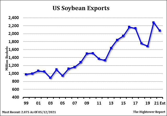 Nearby soybeans, corn and wheat were lower. Soymeal and soyoil were also lower. New crop corn and soybeans ended higher. US stocks were lower. US Dollar was lower. Crude was lower. WH Council of Economic Advisors said any inflation would be temporary. Slow weekly US export sales and forecast of some rains across US Midwest triggered selling in the nearby futures. Lower China soymeal values weighed on soymeal futures. Some forecast .50 to 2.0 rain with 40% coverage of the Corn belt in the 1-5 day outlook, with rain favoring the SE. Moisture stress is expected to increase from the current 18 pct of the Corn belt to 50 pct of the Corn belt over the next two weeks (concentrated in the north-western area). Weekly US soybean exports were near 8 mil bu. Season to date exports are near 2,082 mil bu vs 1,315 ly. USDA goal is 2,280 vs 1,682 ly. Most are looking for US to keep US 2020/21 soybean carryout near 120 mil bu and 21/22 at 140.