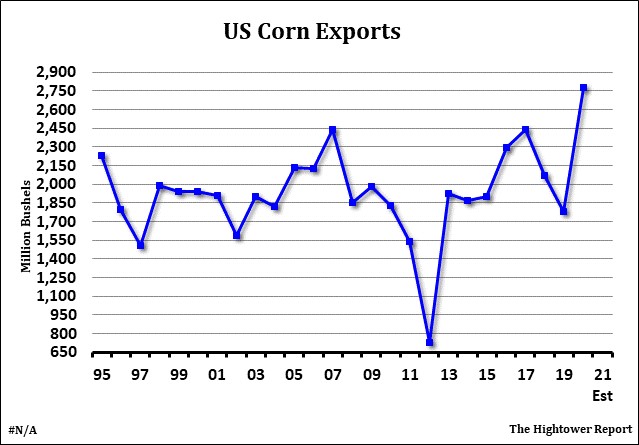 Nearby corn futures ended lower on talk of some Midwest rains and lower than expected weekly export shipments. Over the weekend the 30 and 60 day EU weather models suggested that most of the US upper Midwest and north plains could be warmer and drier than normal. This helped CN test 7.06 and CZ test 6.18. American GFS model continues to suggest rains across the upper Midwest. Some forecast .50 to 2.0 rain with 40% coverage of the Corn belt in the 1-5 day outlook, with rain favoring the SE. Moisture stress is expected to increase from the current 18 pct of the Cornbelt to 50 pct of the Corn belt over the next two weeks (concentrated in the north-western area). Weekly US corn exports were near only 55 mil bu. This was below trade expectations and trigged selling in CN. Season to date exports are near 2,063 mil bu vs 1,176 ly. USDA goal is 2,775 vs 1,778 ly. Some feel final exports could be closer to 2,875. Some are looking for US final 2020/21 corn carryout closer to 1,050 mil bu vs USDA 1,257 and US 2021/22 carryout near 1,150 vs USDA 1,507. One analyst suggested that if US final 2012 corn yield would be near last year’s 172, nearby corn futures could test the 2012 high near 8.44.