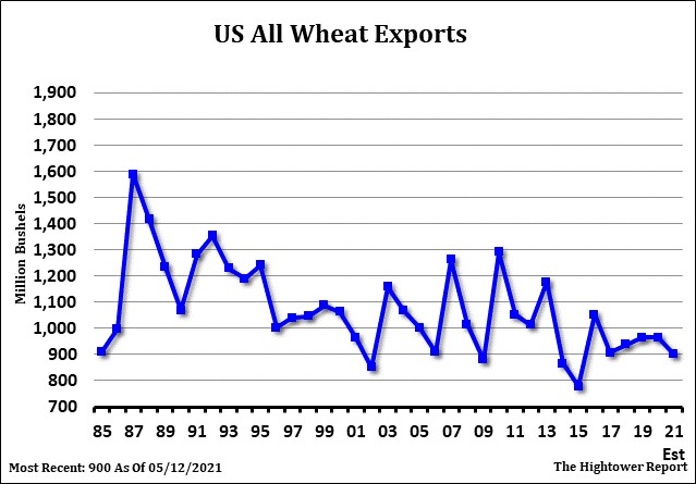 Wheat futures traded lower led by MWN. Talk of rains across parts of Canada prairies and US HRS area triggered long liquidation. Nearby Chicago and KC futures followed lower corn despite lower US Dollar. Over the weekend, the EU 30 and 60 day weather forecast calls for below normal rain and above normal temps for the US north plains, PNW and Canada prairies. Over the next 1-5 days these areas could see .40-1.50 inches of rain favoring SE Saskatchewan and SW Manitoba and 4 counties in NW North Dakota. Last week, Informa said that if weather Continues dry final US HRS crop could drop 65 mil but from their est of 505 mil bu and 530 last year. Weekly US wheat exports were near 15 mil bu vs 18 ly. Season to date exports are near 5 mil bu vs 8 last year. USDA could raise US wheat crop on June 10 but lower final US HRS crop could tighten the supply.