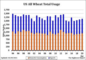 Wheat futures traded lower. Fact USDA made few changes to US 2020/21 Wheat supply and demand offered resistance to futures. USDA did lower HRW exports 20 mil bu and raised white the same. USDA did drop World Wheat stocks 5 mmt due to higher China feed demand. Trade was looking for USDA to lower their estimate of EU and Russia exports. EU due to declining supply and Russia due to higher export taxes. US south plains forecast calls for some rains esp in east areas. US HRW crop is emerging from dormancy and for now looks ok and may have survived the record cold temps. Drop in La Nina could suggest more favorable April and May US Midwest and south plains weather. Weekly US wheat export sales are estimated near 150-350 mt versus 219 last week. Matif and Black Sea wheat futures traded lower. USDA estimates US 2020/21 wheat carryout at 836 mil bu. Most private groups est US 2021 wheat crop near 1,832 mil bu and 2021/22 carryout near 705. Some feel WK support is near 6.00-6.10. US millers have good wheat ownership into June. Barkers have less coverage but current prices could trigger new buying.