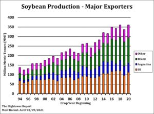 Corn futures traded lower. Technically selling weighed on futures. Talk of increase South America supplies and exports offered seasonal resistance. Still US domestic cash values are strong and futures inverse suggest tighter US supplies. Some fear that USDA may not make big changes to US 2020/21 balance sheet on March 9. This could disappoint the demand bulls. Managed funds are big longs and could liquidate positions into South America harvest and US planting season. Dalian corn futures remain near historical highs but there is no new evidence of new interest in US corn. Weekly US ethanol production was up 29 pct from last week but still down 21 pct from last year. Stocks dropped 1 pct from last week and are down 10 pct from last year. Margins improved but are still negative. Argentina weather is dry but they are still offering corn for export below US prices. Key to corn prices could be USDA est of US 2021 acres and spring weather. Weekly US corn export sales are near 400-800 mt vs 453 last week. Total commit is near 59 mmt vs 26 last year. USDA goal is 66 mmt vs 45 ly. There is no signs that US export will not meet and could even surpass USDA goal.