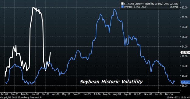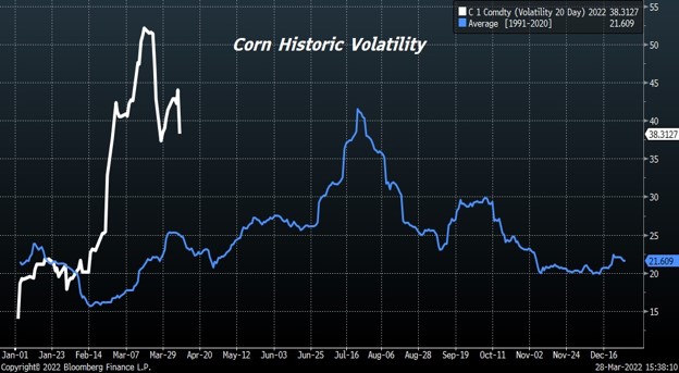 Volatility continues in the corn futures market. Trade again is worried about Ukraine corn exports and if they can plant intended 2022 acres. CK has had an inside day between 7.26 and 7.48. Trade is awaiting USDA estimate of US 2022 corn acres and March 1 stocks. Trade estimates US March 1 corn stocks near 7,877 mil bu versus 7,696 ly. Range 7,630-8.087. USDA tends to find or lose 300 mil bu of corn on recent stocks report. USDA does not count corn in transit or in barges. Trade has been above USDA stocks estimate 10 times in last 17 years and below 7. Trade is also looking for US 2022 corn acres at 92.0 million vs 93.3 ly. Range 89.7 to 93.5. Trade has been above USDA acreage estimate 9 times in last 17 years and below 8. Weekly US corn sales are est at 600-1,000 mt vs 979 last week. There were rumors last week that EU buyers may have bought 800 mt US corn. Trade still waiting for signs that China will switch Ukraine purchases to US.  Trade trying to balance the impact lower China economy, increase Brazil export supplies and Ukraine war versus inflation threat and US 2022 weather unknown.