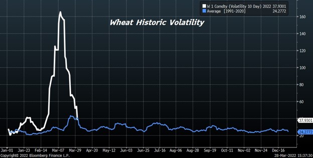 Another wild day in wheat. WK ended near 10.27 with a range of 10.02-10.41.KWK ended near 10.47 with a range of 10.14 to 10.58. MWK ended near 10.58 with a range of 10.5-10.73.  Some Wheat is being shipped from Russia. Russia released a document offer humanitarian corridor for Ukraine vessels. Problem in getting vessels on with port mined and loading vessels given damage to port elevators. There was also talk of EU giving subsidies to north Africa wheat buyers to buy wheat. Some said North Africa countries would in turn sell oil to EU. Trade is awaiting USDA estimate of US 2022 wheat acres and March 1 stocks. Trade est March 1 wheat stocks at 1,045 mil bu vs 1.311 ly. Trade has been above USDA 9 times in last 17 years and below 8. Trade est US 2022 wheat acres at 47.8 vs 46.7 ly with range 45.9-48.9.Trade has been above USDA 8 times in last 17 years and below 9.Weekly US old crop wheat sales are est at 50-300 mt vs 155 last week and 150-500 mt new crop vs 367 last week. US south plains 8-14 day weather forecast is warm and dry.