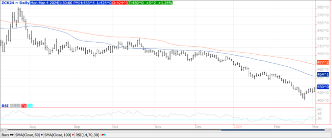 Prices firmed up in late trade closing $.04 – $.05 higher with old crop leading the recovery. May-24 briefly traded above LW high at $4.32 before backing off. The USDA announced the sale of 110k mmt of corn to Taiwan. Export inspections at 43 mil. bu. were in line with expectations. YTD inspections at 812 mil. bu. are up 35% from YA, vs. the USDA forecast of up 26%. Corn used in the production of ethanol in Jan-24 at just under 434 mil. bu. was below expectations and down 10% from Dec-23. In the first 5 months of the 23/24 MY usage is up 5.4% from YA, vs. the USDA forecast of up 4%. Money managers were buyers of just over 45k contracts of corn last week reducing their short position to 295k contracts. AgRural reports Brazil’s 2nd corn crop plantings have reached 86%, up from 73% LW. At the Commodity Classic on Fri. USDA Ag. Sec. Vilsack stated a final ruling on whether corn based ethanol will be eligible for tax credits in the production of SAF will be made in “week’s, not months”. A close above $4.32 this week in May-24 futures should give bulls increased confidence near-term lows are in.