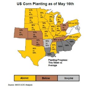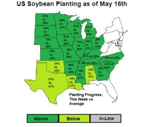 SN traded lower on talk that 16.00 may have ration US demand. US soybean exports have slowed and NOPA crush was lower than expected. Lower crush supported soyoil futures. There remain some concern over Asia vegoil demand especially in India where virus continues to spread. Support had been found earlier on talk that USDA 23 mmt increase in World 2021/22 soybean crop offered resistance. Still, these numbers include record 2022 Brazil soybean acres and yield. It also include record US 2021 acres and yield. Finally it includes 3 pct increase in Argentina 2022 acres and 7 pct increase in yield. This might be optimistic. US soybean planting was reported at 61 pct vs 37 average. Soybean planting was most behind in LA (45 vs 7 avg). Soybean planting was most ahead in SD (66 vs 24 avg), MN (88 vs 47 avg) and MI (61 vs 24 avg).