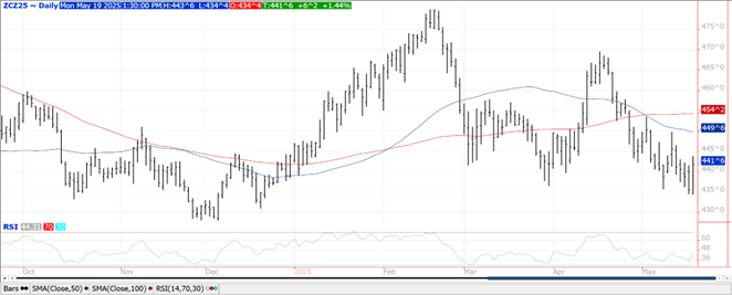 Prices surged late closing $.04-$.07 higher.  Nearby spreads weakened while deferred spreads firmed a touch.  Dec-25 futures plowed thru Friday’s high in late trade.  Inside trading session for July-25.  US weather saw rains continued to linger in the N. plains and WCB this weekend.  NE was able to pick up anywhere from .50” to 2+” of much needed rainfall.  Widespread rains ranging from .75” to as much of 3+” is expected across the central Midwest and ECB this week.  Some of the late seeded crops across the Southern and eastern Midwest will fall behind their historical averages with some areas prone to flooding.  Export inspections rebounded to 68 mil. bu., at the high end of expectations and above the 46 mil. bu. needed to reach the revised USDA forecast of 2.60 bil. bu.  The previous week’s inspections were revised up by 3 mil. bringing YTD inspections to 1.793 bil. up 29% from YA vs. the USDA forecast of up 13%.  Largest takers were Mexico with 19 mil. and Japan with 11 mil.  Money manager sold nearly 99k contracts LW, flipping their position to net short 85k, their largest short in 7 months.
