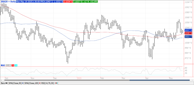 Prices were mostly higher with beans up $.01-$.03, bean oil was up 50 points while meal was a $1 lower.  Spreads across the complex were mixed.  July-25 beans traded below LW’s low and 100 day MA support however failed to see follow thru weakness, enabling prices to recover.  Inside trade for Nov-25 beans.  Also an inside session for July-25 oil.  Fresh 6 week low for July-25 meal however still holding above its contract low at $289.70.  Meal prices are weaker despite the USDA announcing the sale of 145k mt to the Philippines.  Spot board crush margins rebounded another $.03 to $1.33 ½ bu. with bean oil PV inching up to 45.9%.  The US $$$ was sharply lower however settled well off session lows.  The weakness was largely driven by Friday’s downgrade of US credit to Aa1 from Aaa by Moody’s.  Export inspections at 8 mil. bu. were below expectations and a MY low.  They were also below the 13 mil. needed to reach the revised USDA forecast of 1.850 bil. bu.  YTD inspections at 1.622 bil. are up 11% from YA vs. USDA forecast of up 9%.  Egypt was the largest taker with 2 mil. bu.  MM’s were moderate to lite buyers across the soybean complex LW.