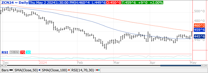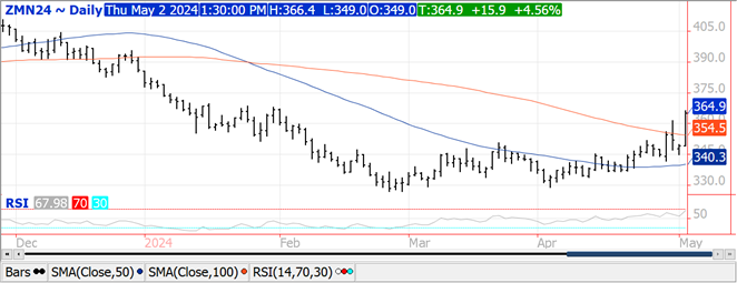 Prices surged to new highs late closing $.05 – $.09 better with spreads also narrowing. July-24 closed right at its 100 day MA while briefly trading above its March high of $4.60. Dec-24 closed above its 100 day MA resistance however held just below its March high at $4.81. While flooding rains continue to ravage far Southern Brazil, much of the central and northern growing regions remain dry, stressing the late developing 2nd corn crop. Export sales at 30 mil. bu. were in line with expectations. YTD commitments at 1.840 bil. bu. are up 23% from YA, vs. the USDA forecast of up 26%. Today’s census export data from Mch-24 showed 232 mil. bu. shipped during the month, only about 6 mil. above weekly inspections. To reach the current USDA forecast, sales in the last 5 months of the MY need to reach 922 mil. vs. only 784 mil. YA. Near today’s close the BAGE lowered their Argentine production forecast another 3 mmt to 46.5 mmt, well below the USDA April-24 forecast of 55 mmt. Harvest progress advanced only 2% to 22%.
