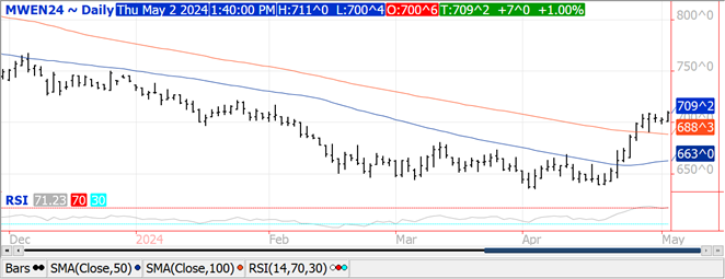 Prices closed higher across all 3 classes in 2 sided trade. KC led the way closing $.11 higher while MGEX and Chicago were $.04 – $.07 higher. MGEX July-24 reached a 3 month high. Rains are expected to provide some relief to dry areas of W. KS and the TX/OK panhandles, but by no means a drought buster. Spotty rains have brought only modest relief to wheat areas near the Black Sea region. Export sales at 14 mil. (-1 mil. -23/24, 15 mil. for 24/25) were in line with expectations. YTD commitments are now down 1% from YA, vs. the USDA forecast of down 6.5%. New crop sales were 6 mil. – HRW, 4 mil. – HRS, while SRW and white wheat were just over 2 mil. each. Census exports in March at 77.5 mil. were roughly 4 mil. over weekly inspections vs. 68 mil. in Feb-24 and up 54% from Mch-23. In order to reach the current USDA export forecast of 710 mil. bu. sales will need to reach 142 mil. in April/May vs. 109 mil. YA. US winter wheat area in drought fell 2% last week to 28%. Ukraine expects their wheat exports to slip to 14 mmt in 24/25, vs. 18 mmt in the current MY.