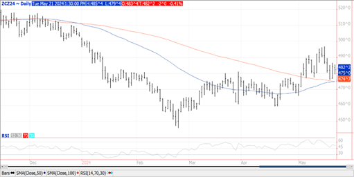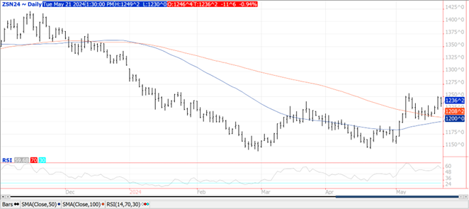 Prices were down $.02 – $.03 today forming an inside day on the charts.  July held support at its 100 day MA near $4.55.  Next support is the May low at $4.43 ¾.  Support for Dec-24 is at $4.75 where both the 50 and 100 day MA’s have converged.  The USDA reported the sale of 110k mt (4.3 mil. bu.) of corn to Spain, and 113k mt of corn to Mexico.  Half of the corn sold to Mexico was 23/24 MY and half 24/25 MY.  US corn plantings advanced 21% LW to 70% complete, at the high end of expectations.  Progress remains behind YA pace of 76% and just below the 5-year Ave. of 71%.  Emergence at 40% in line with recent history.  Big gains were made across the northern plains and Midwest with the Dakota’s leading the way.  SD advanced 34% to 66% complete with ND advancing 29% to 51% complete.  WI advanced 26%, MN and IL 25%, NE 24% and IA 21%.  Based off March planting intentions and the progress report their remains 3.6 mil. acres left to plant in IL, 2.8 mil. in IA, 2.35 in IN, 2.1 mil. in NE and 1.5 mil. in MN, areas expected the heaviest rains this week.  2019 was the last year we witnessed a significant amount of corn acres get switched to other crops or lost to prevent planting.  March intentions that year at 92.8 mil. fell 1.1 mil. in June to 91.7 mil. with final acres down another 2 mil. to 89.7 mil.  Corn plantings in 2019 were only 65% by the end of May while this year we’ll likely be close to the historical average of 85%.  As of May 3rd EU corn imports had reached 15.7 mmt, no YOY comparisons were available.  Tomorrow’s EIA report is expected to show ethanol production between 990 – 1,028 tbd last week vs. 1,000 bpd the previous week.