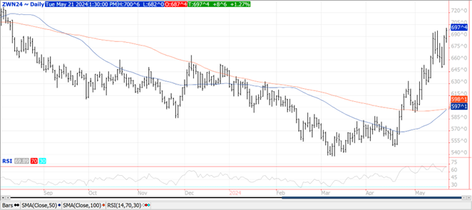 Prices closed mostly higher as all classes experienced two sided trade.  Chicago led the way higher, up $.07 – $.09, KC was $.04-$.06 higher, while MGEX was steady to $.01 lower.  Chicago July-24 established a fresh 9 month high while also briefly trading over $7.00.  KC July-24 failed to trade above its recent high at $7.10.  Little moisture is expected across the SW plains this week as drought conditions deepen.  Winter wheat conditions slipped 1% to 49% G/E vs. expectations for a 1% improvement.  Despite the modest decline overall ratings remain the highest since 2020.  Ratings improved 2% in KS to 33% G/E while poor/VP fell 2% each.  Ratings in IL fell 7% to 70% G/E.  69% of the crop is headed, vs. 58% LW and 5-year Ave. of 57%.  Spring wheat plantings advanced to 79%, ahead of YA pace of 57% and 5-year Ave. of 48%.  Jordan passed on all offers for their tender for 120k mt of milling wheat citing prices were too high.  Tunisia is seeking 100k mt of soft milling wheat with offers due tomorrow.  IKAR cut Russia’s wheat production forecast another 2.5 mmt to 83.5 mmt, vs. the USDA est. of 88 mmt.  IKAR also cut their export forecast 2 mmt to 45 mmt, vs. the USDA est. of 52 mmt.