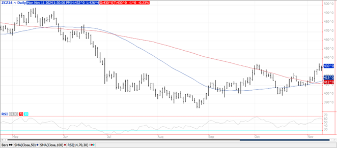 The soybean complex finished lower across the board with beans down $.05-$.08, meal was $1 lower while oil was rebounded to close only 60-70 lower.  Spreads were steady to weaker all around.  An inside day for Jan-25 beans as it once again failed to extend gains above its 100 day MA.  Jan-25 also closed below its 50 day MA support at $10.23 ¼.  Late weakness in Dec-24 meal established a fresh contract closing low.  Dec-24 oil recovered to close back over the $.48 level.  Spot board crush margins slipped $.04 ½ to $1.67 bu. with bean oil PV slipping just below 45%.  Dryer weather is expected across southern Brazil and Argentina this week with better prospects for rain in week 2.  Central and northern growing regions of Brazil to see off and on rains this week.  The Malaysian Palm Oil Board reported Oct. production at 1.797 mmt, down from 1.821 mmt in Sept., however slightly above expectations.  Despite the higher than expected production, stocks fell 6% to 1.885 mmt, below expectations of 1.92 mmt.  Their Oct. exports at 1.732 mmt were up 17% from Oct-23 and above expectations of 1.629 mmt.  AgRural reports Brazilian plantings have reached 67%, above the YA pace of 61%.  Last week MM’s were net buyers of 2k soybeans, 26k soybean oil while being net sellers of 21k soybean meal.  The MM long position in bean oil has swelled to nearly 64k the largest since Jan-23.  MM’s have flipped their soybean meal position to net short for the first time in 7 months.  Stocks/use among global exporters is still expected to rise to a 6 year high at 22%, a touch below the Oct-24 USDA forecasts.