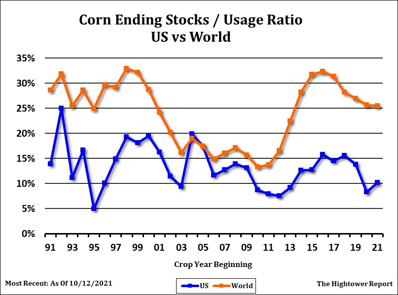 Corn futures ended lower. Informa est US corn yield near 178.7 which adds 185 mil bu to crop and carryout if USDA does not raise demand. Some feel final demand could be up 200-300 mil bu. Informa also raised World 2021/22 corn crop 9 mmt, 4.7 US, 3 Ukraine and 1.5 Argentina. Weekly US ethanol production was up 1 pct from last week and up 15 pct from last year. Stocks were up 1pct from last week and up 2 pct from last year. Margins remain positive. Cash basis to processors remain firm. Trade estimates that weekly US corn export sales will be near 700-1,400 mt vs 890 last week. Total commit remains below pace to reach USDA goal. CZ is near 5.64. Key support is near 5.43. Informa est US 2021 corn crop up 185 mil bu from USDA Oct guess. If  USDA does not raise demand, the 185 added crop could be added to USDA 1,500 mil bu carryout. Trade est US 2021 corn crop 31 mil bu higher than USDA Oct. Trade estimates US 2021/22 corn carryout near 1,480 vs USDA 1,500. Range is 1,355 to 1,576. Trade estimates World corn end stocks near 301 mmt vs 302 in October. Range was 294-304. US 7 day Midwest weather is dry which should advance harvest. Day 8-10 brings rains back to the east Midwest.