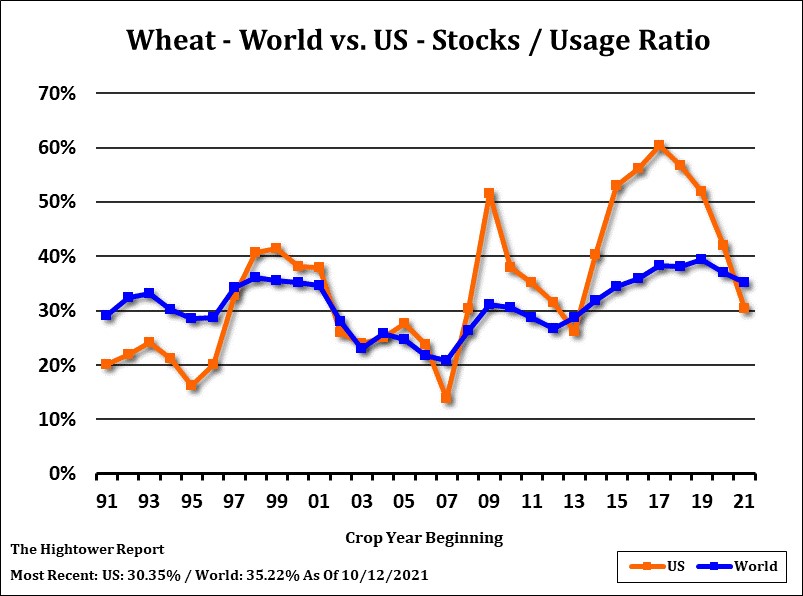 Wheat futures ended lower. Talk of lower US domestic spring wheat basis and fact US wheat export prices are a premium to Black Sea triggered some long liquidation. There was also talk that funds may be done buying wheat futures. Their buying from 7.20 WZ was linked in part to higher Russia and EU prices and concern about inflation. US farmers were encouraged to increase 2021, 2022 and 2023 cash sales at current prices. Weekly US wheat export sales are est near 180-500 mt vs 269 last week. Commit is running behind USDA goal. WZ is near 7.81, KWZ is near 7.90, MWZ is near 10.44. OZ is down to 7.54. Trade est US 2021/22 wheat carryout near 581 mil bu vs USDA 580. Range is 565-607. Trade also estimates World wheat end stocks near 276.5 mmt vs USDA 277.2. Range is 274-282. Informa est Canada 2022 wheat crop near 31 mmt vs 21 this year, US 56 vs 44, EU 139 vs 136 and FSU 138 vs 134. Key will be North Hemisphere 2022 weather. Most World wheat buyers remain short which could offer support on price breaks.
