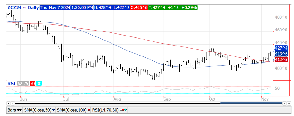 Prices recovered late to close $.01-$.02 higher in choppy 2 sided trade.  Spreads were slightly lower with today being the first day of the Goldman roll.  Dec-24 traded to its highest level in a month with next resistance at the early October high at $4.34 ¼. With yesterday’s speculative traders reporting buying nearly 20k contracts of corn flipping the money manager position to net long for the first time in 15 months.  Exports at 112 mil. bu. (109 mil. – 24/25 MY, 3 – 25/26) were above expectations.  YTD commitments at 1.040 bil. are up 48% from YA, vs. the USDA forecast of up 1.4%.  Current commitments represent 48% of the USDA forecast, above the historical average of 41%.  Shipments are up 32%.  Noted buyers last week were Mexico 55 mil. old crop and 3 mil. 25/26, unknown – 27 mil. and Japan – 12 mil.  In addition, the USDA announced a fresh sale of 120k mt (4.7 mil. bu.) to an unknown buyer.  Commitments to Mexico at just over 470 mil. bu. are a record high for the end of Oct.  Commitments to unknown at just over 250 mil. bu. are at the highest level in at least a decade.  There has been some speculation China may have also been boosting US corn imports ahead of the potential for Trump tariffs.