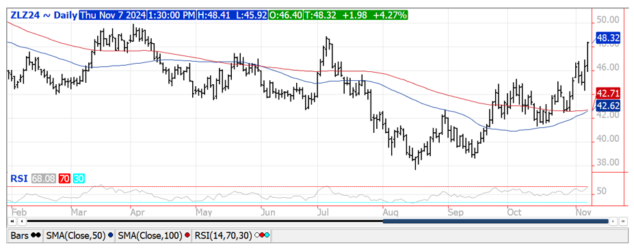 The soybean complex finished higher across the board with beans up $.20-$.23, meal is steady to $2 higher, while oil soared $.02 lbs.  Spreads however were steady to weaker across the complex.  A late surge enabled Jan-25 beans to close at its highest level in nearly a month while also closing above its 50 day MA resistance at $10.24 ½.  Dec-24 meal traded to a new high for the week then rolled over.  Support is at the contract low at $293.10.  Dec-24 oil surged to fresh 4 month high with next resistance at the July high of 48.89.  Spot board crush margins improved $.01 to $1.73 bu. with bean oil PV jumping to a 15 month high at 44.7%.  Light rains are forecast for Argentina thru early next week before turning dryer in week 2 of the outlook.  Brazil is expected to see a good mix of rain and sunshine over the next few weeks keeping production prospects favorable.  Bean exports at 75 mil. bu. were in line with expectations and bring YTD commitments to 1.040 bil. up 17% from YA vs. the USDA forecast of up 9%.  Commitments represent 56% of the USDA forecast, below the historical average of 60%.  China/unknown combined to buy 50 mil. bu. bringing commitments to 678 mil. bu. now well above YA at 629 mil. Soybean meal sales at 399k tons were in line with expectations.  Soybean oil sales were huge at 114k mt.  YTD commitments at 234k mt are more than 8 times higher than YA, vs. the USDA forecast of down 8%.  This week’s sales represent 42% of the export forecast for the entire 2024/25 MY!  The recent surge in Palm oil prices to 2 year highs has enabled US bean oil to grab a bigger chunk of the global vegetable oil trade.