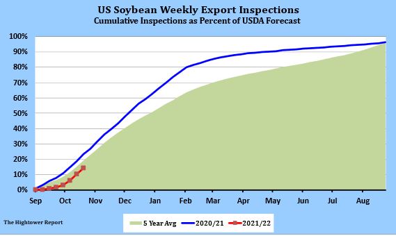 Soybeans closed sharply higher on the session with an outside-day up which is a positive technical development. A continued strong advance in palm oil supported strength in the soybean oil. Strength in energy markets added to the positive tone for vegetable oil markets. Trade houses in Brazil see plantings near 36% complete as good weather continues to allow plantings at a faster than normal pace. Fears that very high crush margins will spark a sharp advance in soybean meal production helped to push meal lower after an early rally to the highest price level since September 30. For the weekly crop progress report, traders see soybean harvest at 74% complete, 71–77 range, as compared with 60% complete last week. Soybean export inspections for the week ending October 21 came in at 2,103,505 metric tonnes from trade expectations for 1.800-2.625 million tonnes. Cumulative inspections year-to-date are 8,129,440 metric tonnes which is 45.0% below last year. This is 14.3% of the USDA’s forecast for the 2021-22 marketing year versus the five year average of 19.3%. Along the Illinois River, soybean bids dropped by 15 cents.
